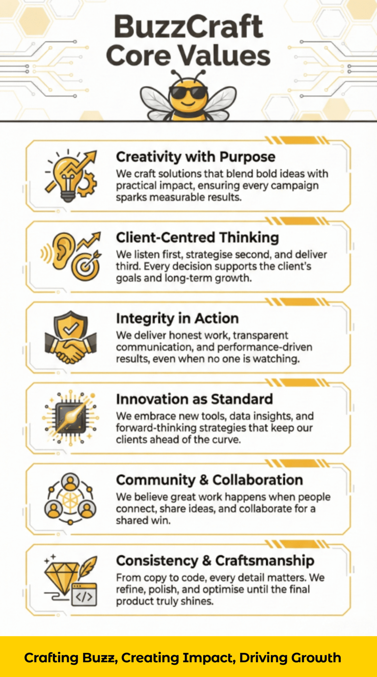 BuzzCraft operates on core values that shape our approach and define our character in the digital marketing landscape. Excellence emerges organically when guided by principles prioritizing innovation, integrity, and authentic client partnerships.