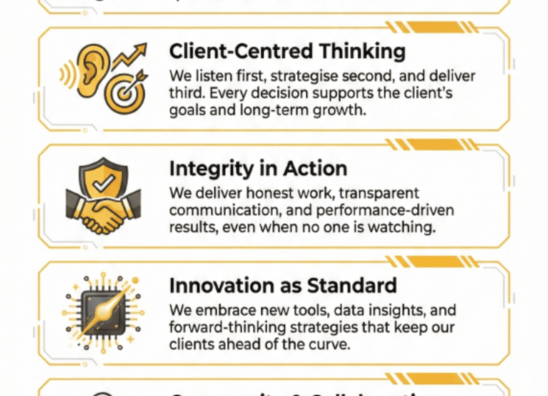 This values-driven framework ensures our work achieves your business objectives while building trust, fostering authentic connections, and creating sustainable digital value aligned with your organization's vision in today's rapidly evolving online marketplace.
